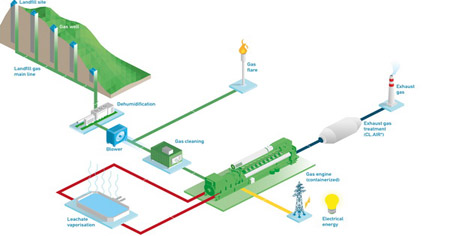 Jenbacher Yaklaşımı Jenbacher çöpgazı motorları, düşük alt ısıl değerli yakıt ile çalışabilme imkanı ve dalgalı gaz kalitesi ve basıncına rağmen özellikle tam yükte ve yüksek verim ile yüksek emre amadelikte çalışmak üzere tasarlanmışlardır. Yüksek kalitede ve özel olarak tasarlanmış bulunan motor aksamları, bu tür yakıtta çoğunlukla ortaya çıkan kirliliklere karşı dayanıklıdırlar. Çöp gazı gaz motorlarına verilmeden önce nemden arındırılmalı ve basınçlandırılmalıdır. Eğer çöpgazı içinde siloksan gibi agresif kirleticiler varsa mutlaka bertaraf edilmelidir. Bu önlemler sadece jeneratörün kullanılabilirliğini önemli ölçüde artırmakla kalmayacak, bunlar aynı zamanda işletme ile ilgili maliyetleri de azaltacaktır. Çöp sahaları genelde büyük kentlere yakın bulundukları için emisyon standartları birçok ülkede gittikçe daha çok katılaşmaktadır. Bu standartlara uyumu sağlamak üzere yakıt gazları durumlarından başlayarak egzoz gazının emisyondan arındırılmasına kadar ki tüm sistemin dikkatlice yönetilmesi gerekmektedir.